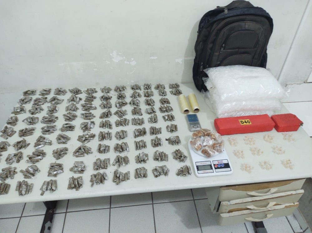 Foram apreendidas 920 porções de maconha, 100 pinos com crack, um tijolo e meio de maconha, sete pedras de crack, três mil pinos vazios, duas balanças de precisão e materiais para embalagem. A ocorrência foi apresentada na Central de Polícia Judiciária (CPJ). Ninguém foi preso.