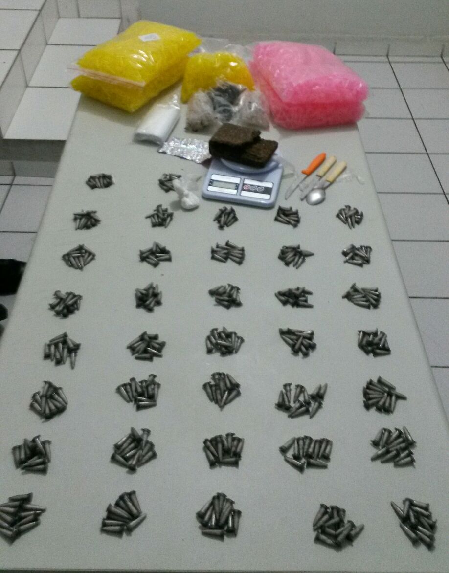 - Aproximadamente 800 pinos com cocaína, 1,5 kg de maconha, uma balança e 6 mil pinos vazios foram apreendidos