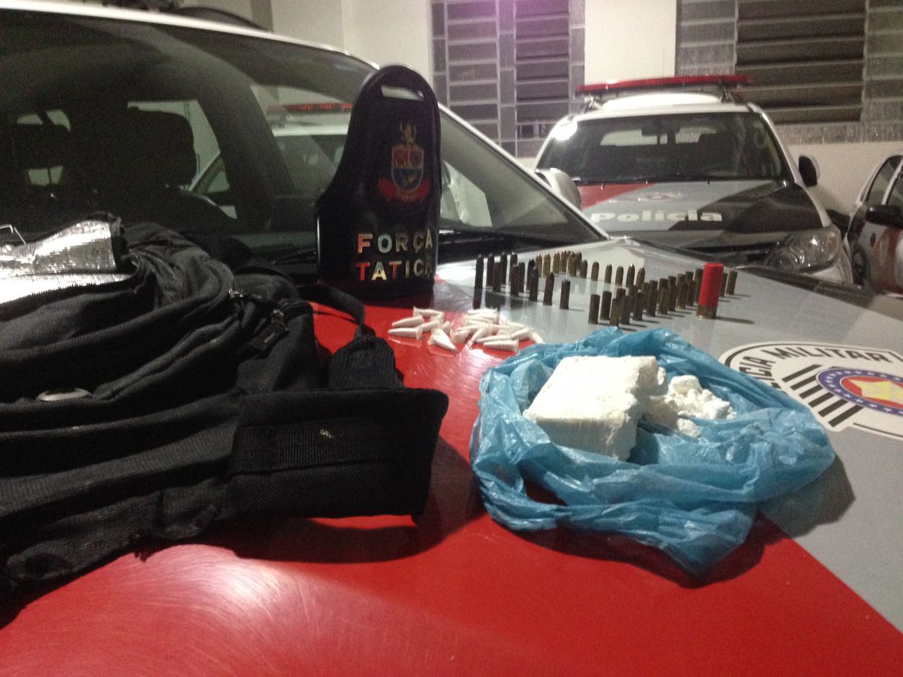 O material foi apreendido e a dupla recebeu presa em flagrante. A perícia confirmou que se tratava de cocaína. Participaram da ocorrência Tático Comando, Tático I-09020 e Tático I-09021.