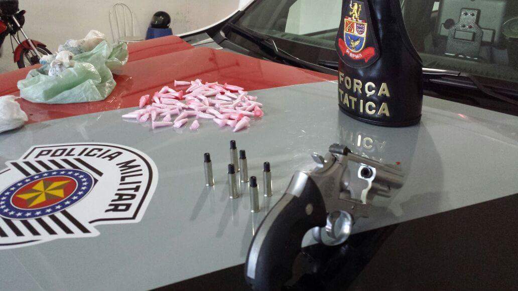 Durante a abordagem foi localizado no meio de sua virilha um revólver calibre 357 com seis munições. Em seus bolsos foram apreendidos 80 pinos com cocaína, uma porção de maconha, 300 gramas de um pó branco aparentando também ser cocaína e R$ 20.