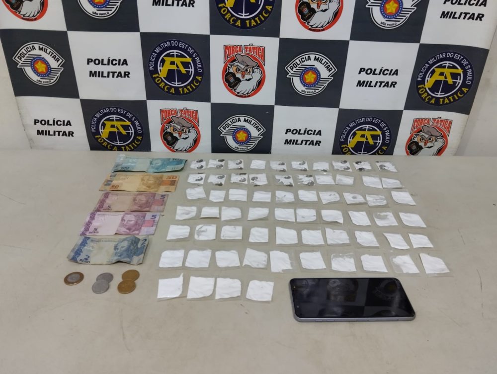 Segundo a polícia, Rodrigues carregava uma sacola com 64 porções de cocaína e R$ 164,50. No bolso da roupa do homem havia um celular que também foi apreendido.