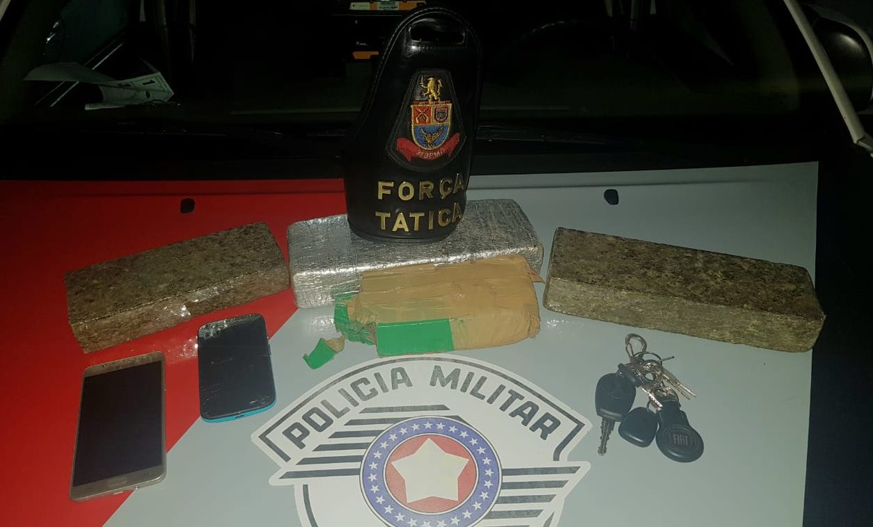 Dentro de uma bolsa que estava no carro, a Força Tática apreendeu quatro tijolos de maconha que totalizaram 3,1 quilos. Tanto Jhones, como a mulher que estava com ele no carro, negaram a propriedade do entorpecente.
