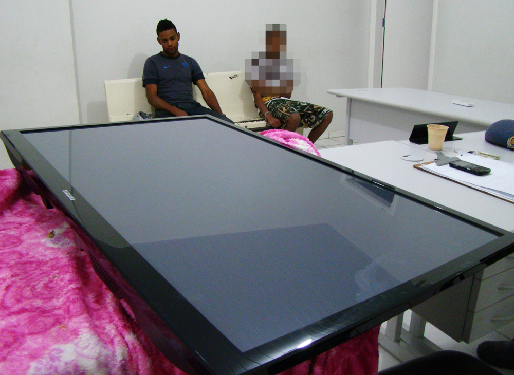 Lucas na esquerda e televisão que foi furtada (Foto: Marília Notícia)