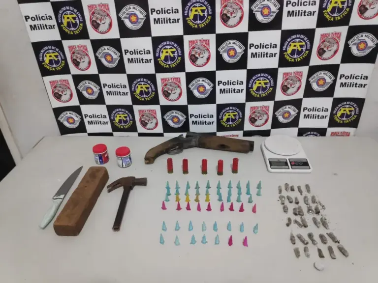Também foi apreendido um aparelho celular, que estava no bolso da bermuda do suspeito e será encaminhado para perícia. De acordo com a PM, a análise do equipamento pode revelar conexões com outros envolvidos no tráfico na cidade.