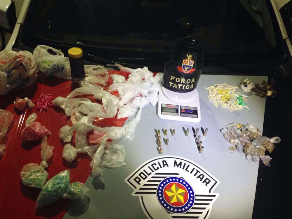 Os policiais apreenderam dentro do veículo 419 pinos com cocaína, 110 pinos com crack, 155 porções de maconha, uma balança digital, 7 munições de calibre 9 mm, 4 munições de calibre 38 e aproximadamente 1.000 mídias de DVDs piratas.