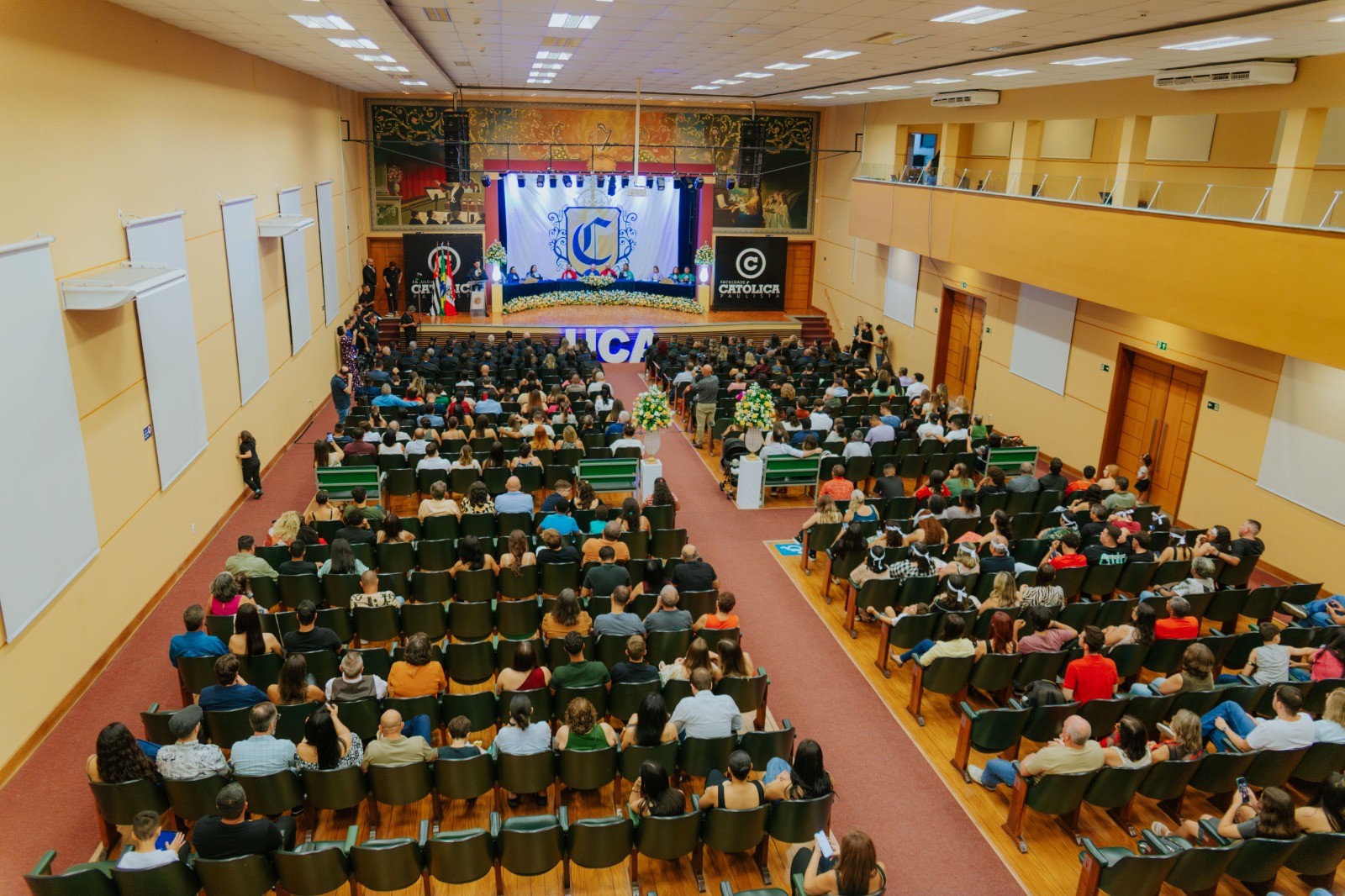 A Faculdade Católica Paulista celebrou, na noite desta sexta-feira (20), a formatura de seus concluintes em cerimônia realizada no teatro do Colégio Sagrado Coração, em Marília. O evento marcou o encerramento de um ciclo para estudantes de bacharelado, licenciatura e cursos tecnólogos. Cerca de 90 alunos participaram presencialmente, enquanto aproximadamente 800 estudantes da Educação a Distância (EAD) acompanharam a cerimônia por transmissão ao vivo.