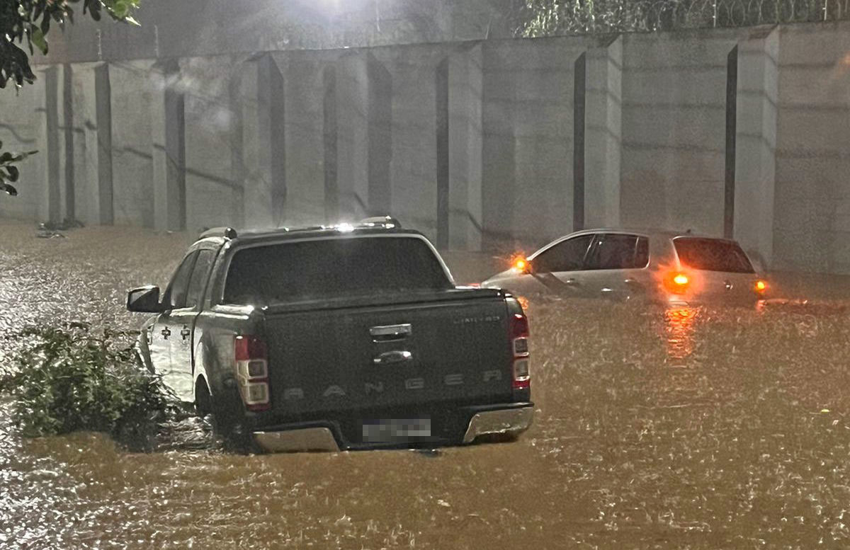 Imagens mostram o momento mais crítico da chuva, quando os veículos acabaram ficando ilhados em meio à grande quantidade de água que ali se concentrou.