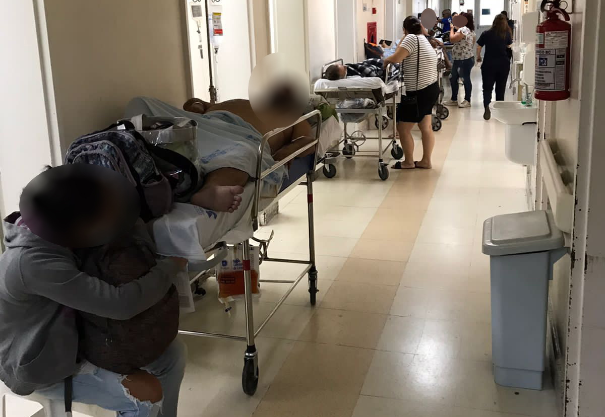 É possível observar que na área de atendimento lotada e nos corredores há pacientes já com vestimenta hospitalar, ou seja, não estão somente de passagem pelo atendimento de urgência ou emergência.