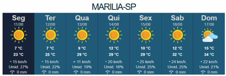 Nesta segunda-feira (11), a mínima foi de 7°C e a máxima de 23°C, com umidade relativa do ar em torno de 27%. Na terça-feira (12), a mínima permanece em 7°C e a máxima sobe para 25°C. A quarta-feira (13) deve ser o dia mais seco da semana, com mínima de 9°C, máxima de 29°C e umidade de apenas 19%.