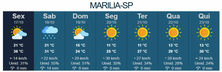 Em Marília, no domingo, o tempo segue instável, mas com temperaturas mais amenas — mínima de 15 °C e máxima de 24 °C. A partir de segunda-feira (20), o tempo volta a firmar, com sol predominando, tardes mais quentes e umidade relativa do ar em declínio.