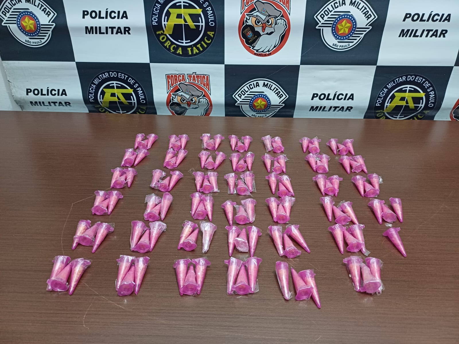 Ao perceberem a presença dos militares, os dois tentaram se separar, mas foram interceptados. Durante a busca pessoal, os policiais encontraram com o adulto um invólucro plástico transparente com 120 pinos com crack.
