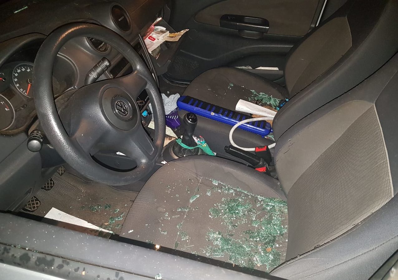 A equipe retornou para a avenida das Indústrias e encontrou o veículo com o vidro do motorista quebrado com uma pedra de tijolo.