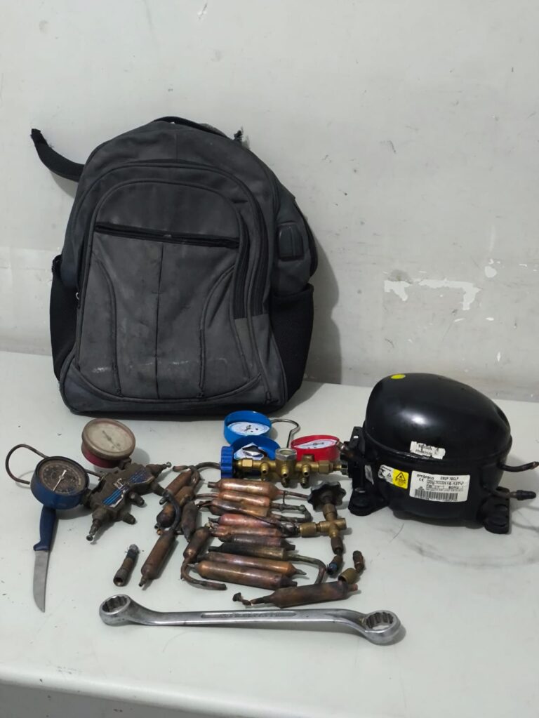 Eles estavam em posse de diversos itens, entre eles um motor de geladeira, ferramentas como chaves de fenda e alicates, registros de pressão, facas, transformadores e filtros secadores de cobre.