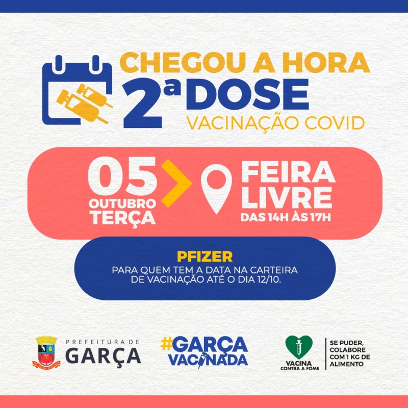 Todos que têm a data da segunda dose na carteira de vacinação até o dia 12 de outubro podem receber o imunizante hoje. A ação acontece no pavilhão coberto da feira livre, das 14h às 17h.
