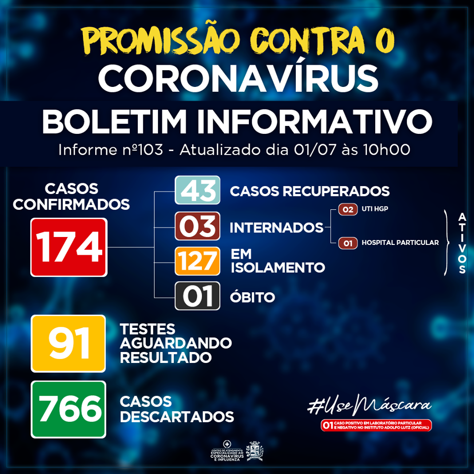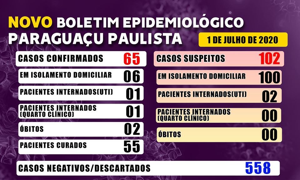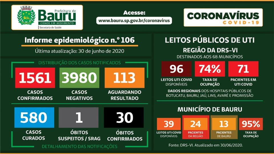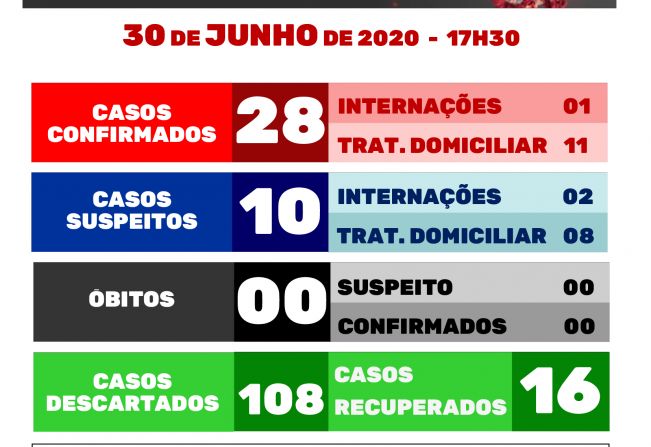 O município soma 1.561 testes positivos da doença, sendo 30 óbitos e 580 pessoas consideradas curadas da doença. Outros 113 casos suspeitos são investigados e um óbito também aguarda resultado de exames.