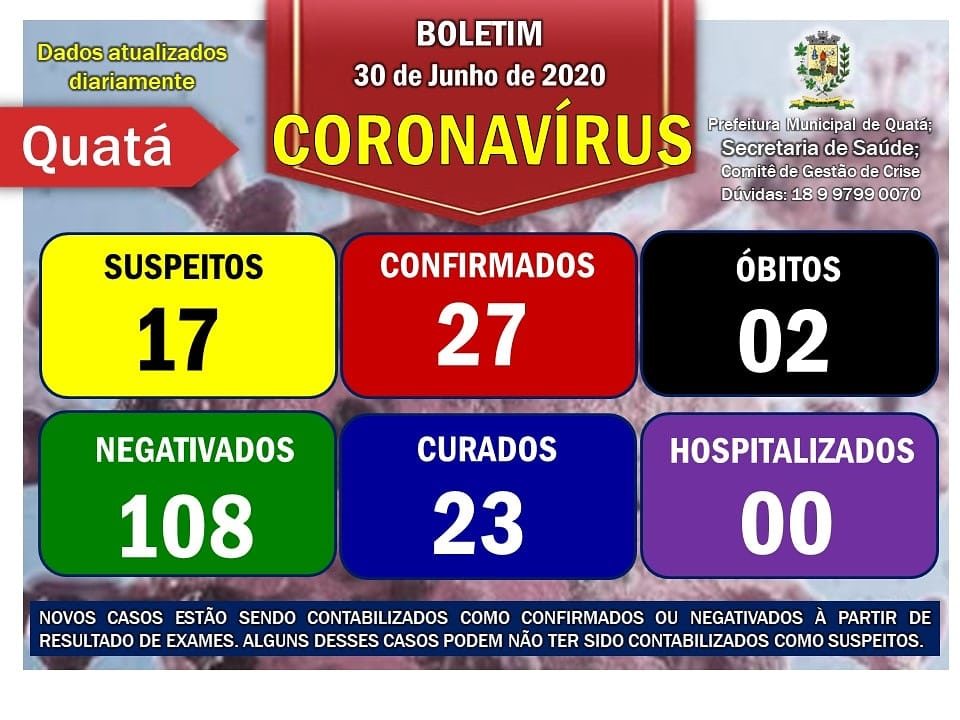 A Prefeitura de Quatá (distante 100 quilômetros de Marília) confirmou mais cinco de Covid-19 e a cidade tem 27 testes positivos da doença.