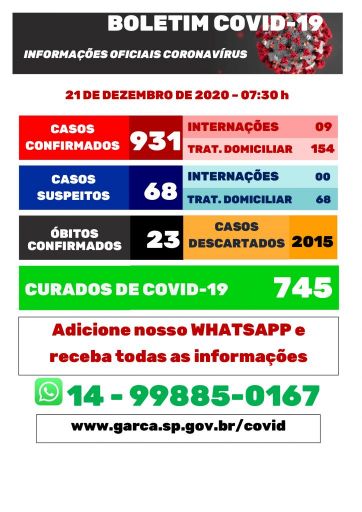 Os casos confirmados subiram de 917 par 931. Segundo a Prefeitura, 154 pessoas estão em isolamento domiciliar, 745 se curaram e 23 morreram.