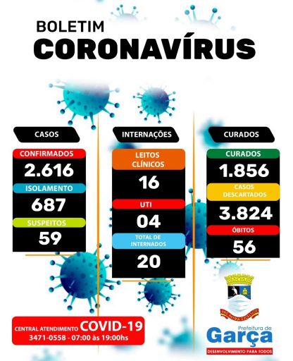 São 2.616 casos confirmados da doença, sendo 687 em isolamento domiciliar, 1.856 curados e 56 óbitos.