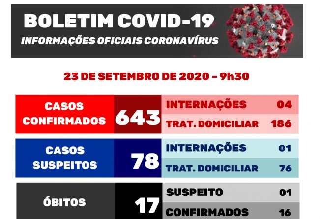 A cidade soma 643 pessoas contaminadas pelo vírus desde o início da pandemia. Desse total, 437 já estão curados, 186 permanecem em isolamento domiciliar e 16 morreram.