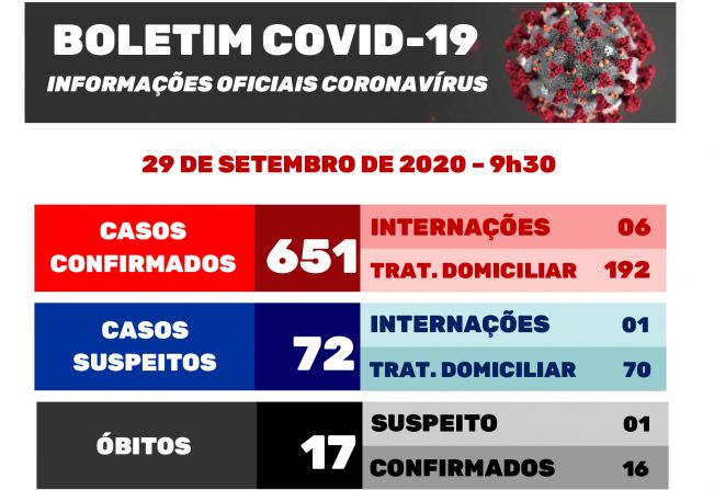 São 651 o número de pacientes infectados pelo novo coronavírus no município desde o início da pandemia. Deste total, 437 já estão curados, 192 estão em isolamento domiciliar e 16 morreram.