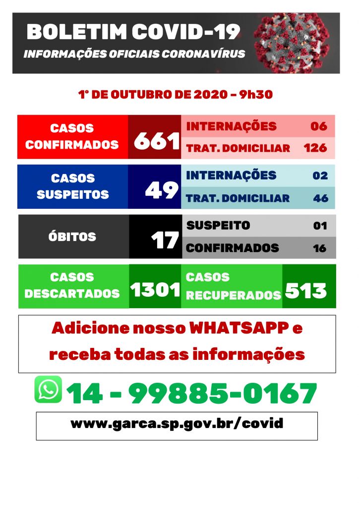 A cidade soma 661 pessoas infectadas no município desde o início da pandemia. Destes, 126 permanecem em isolamento domiciliar, 513 se curaram e 16 garcenses morreram contaminados pelo vírus.