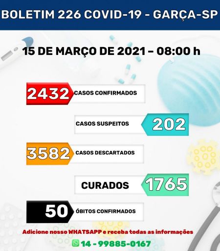 O boletim informa as instituições em que os garcenses estão internados. São quatro em ala clínica e dois na UTI do Hospital São Lucas de Garça, três em ala clínica do Hospital das Clínicas de Marília, um em ala clínica e um na UTI da Santa Casa e um na UTI do Hospital Beneficente Unimar (HBU).