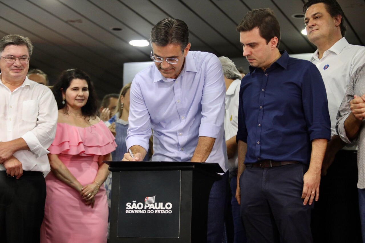 Governador do PSDB assina documentação, ao lado do deputado Vinicius Camarinha e do prefeito Daniel Alonso, do mesmo partido (Foto: Divulgação/Governo de SP)