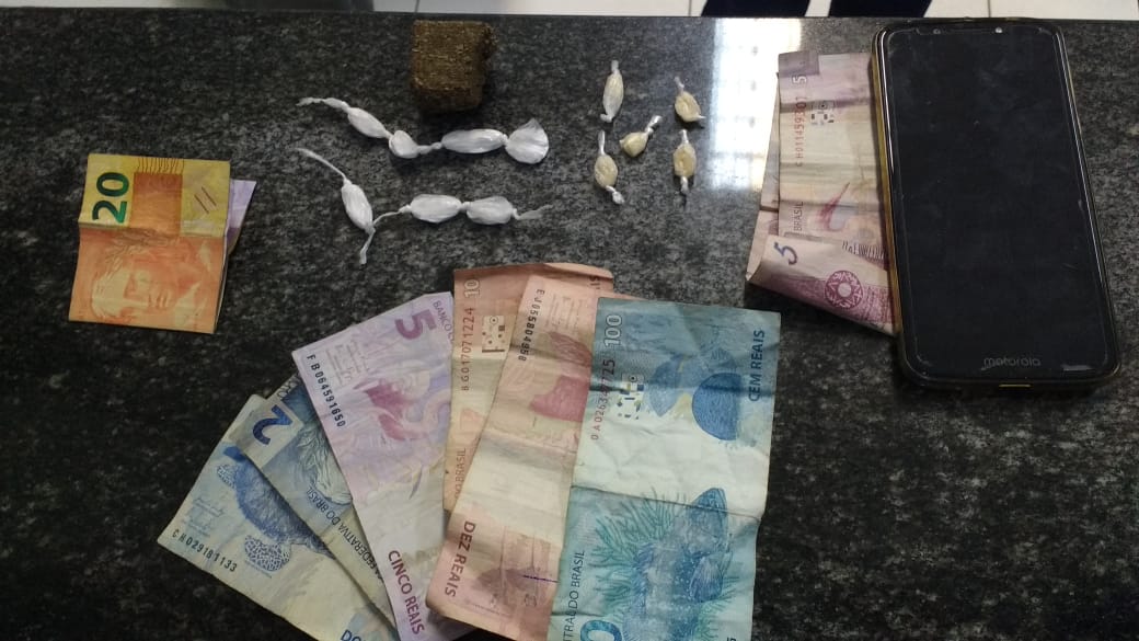 Foram apreendidos sete porções de cocaína e um tijolo de maconha. Na casa também estava outra adolescente com um celular e R$ 25.