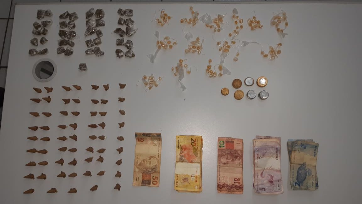 O adolescente acabou tropeçando, caindo e sendo abordado. Na sacola, que estava com ele, foram encontrados 61 pinos de cocaína, 41 porções de maconha e 129 pedras de crack, além de R$ 278.