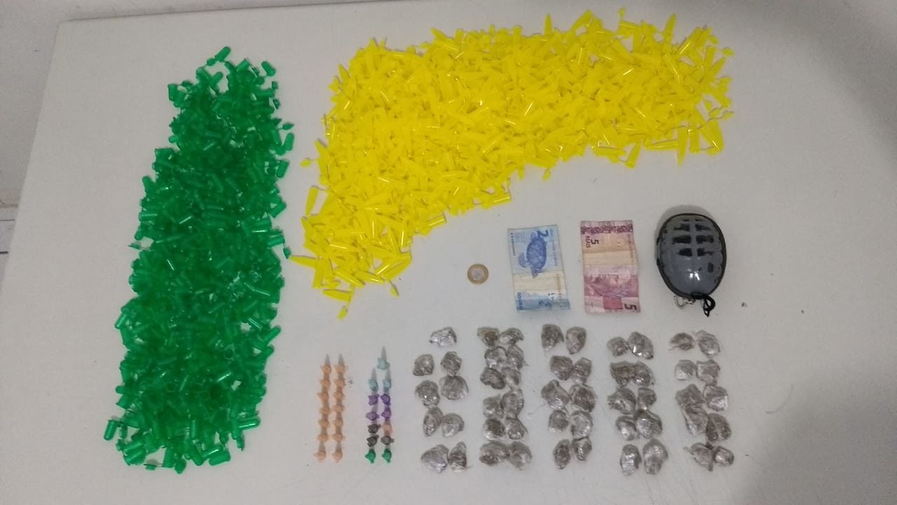 Os militares fizeram a abordagem e com um dos garotos encontraram R$ 8. Com o apoio do Canil foi feita uma varredura no terreno em que os menores adentravam e foi localizada uma sacola com 14 pinos de crack, 13 pinos de cocaína, 51 porções de maconha e 1201 pinos vazios.