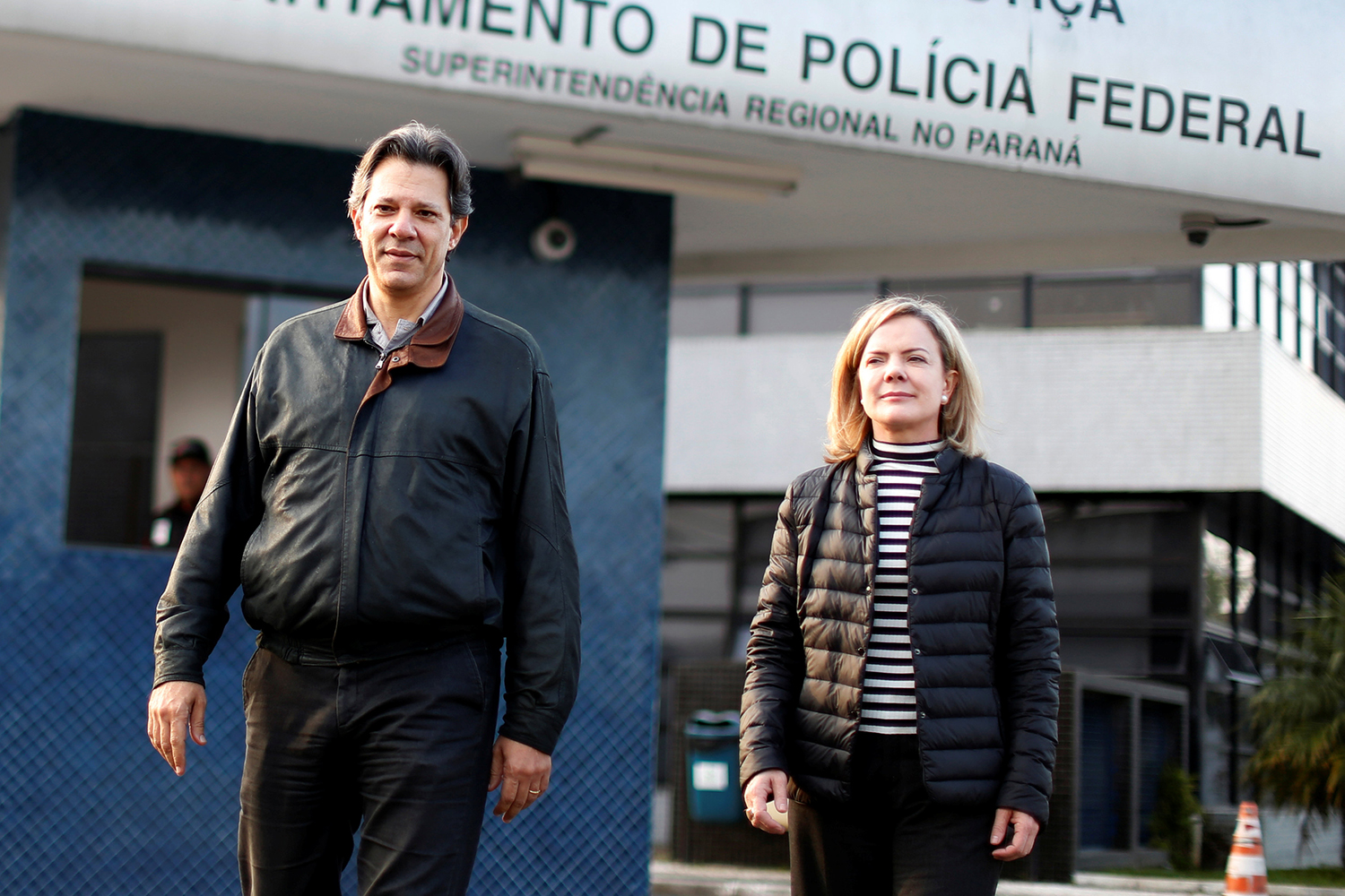 Former Sao Paulo mayor Fernando Haddad and Senator Gleisi Hoffmann leave the Federal Police headquarters, where Brazilian former President Luiz Inacio Lula da Silva is imprisoned, after visiting him, in Curitiba, Brazil August 6, 2018. REUTERS/Rodolfo Buhrer