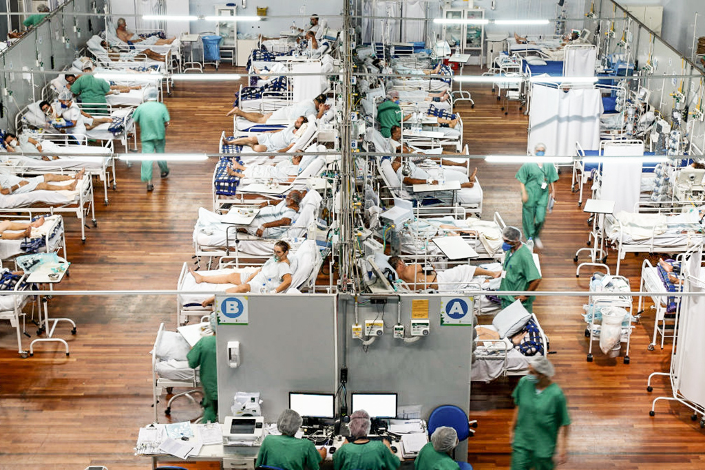 TOPSHOT - Patients affected by the COVID-19 coronavirus remain at a field hospital set up at a sports gym, in Santo Andre, Sao Paulo state, Brazil, on March 26, 2021. - Brazil set a new daily Covid-19 death toll record of 3,650 on Friday, the health ministry said, as the pandemic spins out of control in Latin America's largest economy. (Photo by Miguel SCHINCARIOL / AFP) (Photo by MIGUEL SCHINCARIOL/AFP via Getty Images)