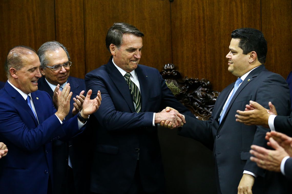 O presidente Jair Bolsonaro, o ministro da Economia, Paulo Guedes, e o ministro da Casa Civil, Onyx Lorenzoni, entregam o Plano mais Brasil – Transformação do Estado ao presidente do Congresso Nacional, Davi Alcolumbre.