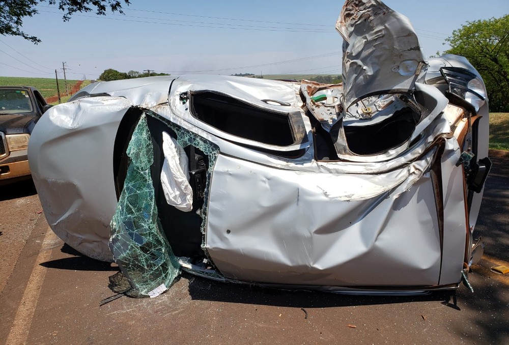 Carro onde estava a mulher grávida capotou após a batida (Foto: Divulgação)