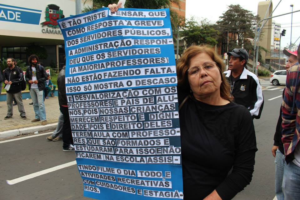 O segundo dia da greve dos servidores públicos municipais teve início com uma manifestação em frente à Prefeitura. As centenas de funcionários da educação, Daem (Departamento de Água e Esgoto de Marília), saúde, coleta de lixo, dentre outros setores, reivindicam reajuste salarial, melhores condições de trabalho e, acima de tudo, valorização da categoria. Para eles, a concessão de apenas 4,5% de reposição foi a gota d’água.