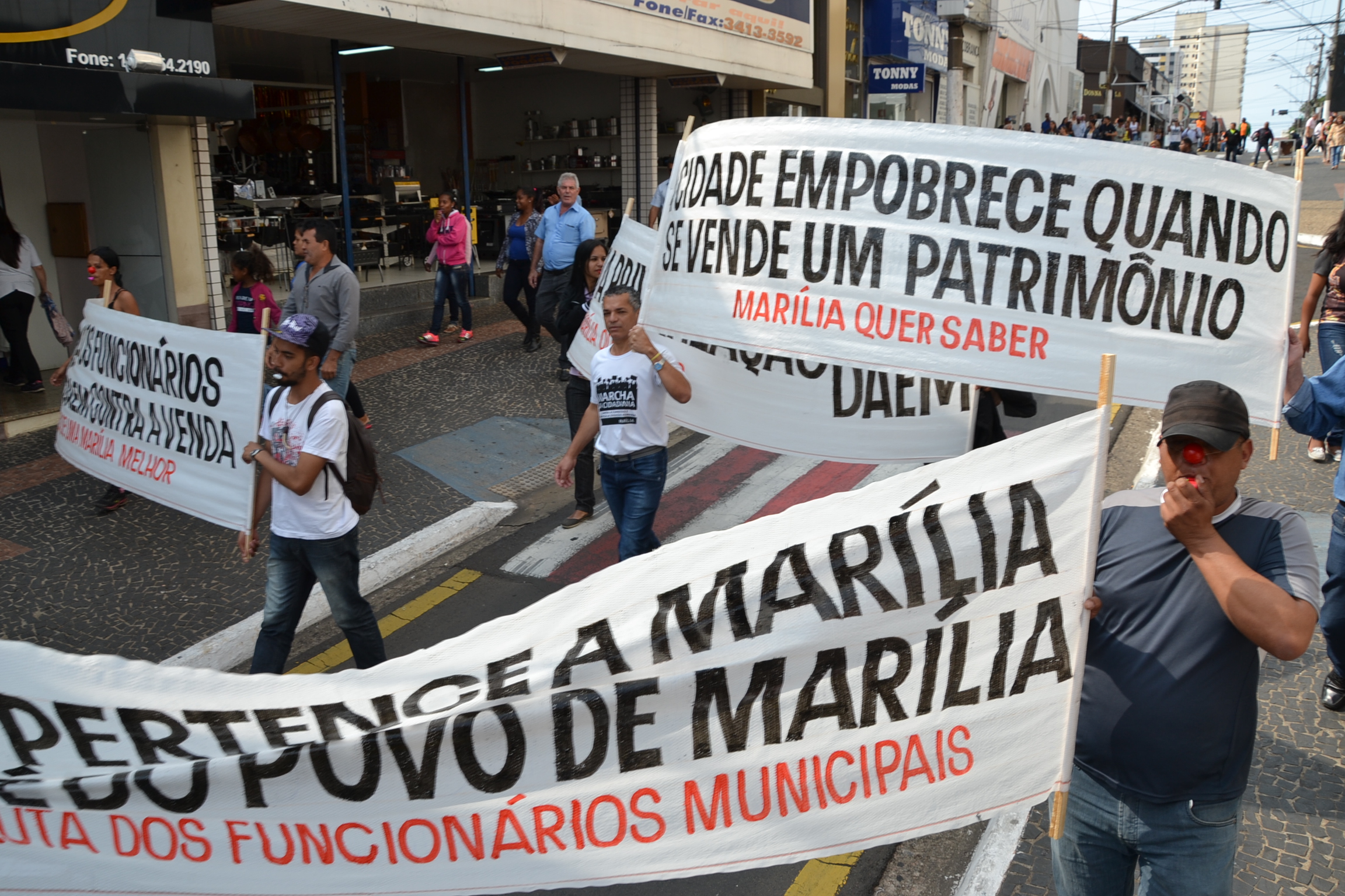 Um grupo de aproximadamente 200 pessoas, segundo estimativa dos organizadores, realizou na manhã desta sexta-feira (15) uma manifestação no Centro de Marília contra a concessão do Daem (Departamento de Água e Esgoto de Marília) à iniciativa privada.