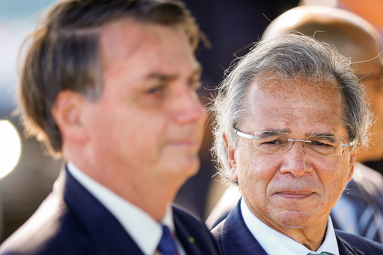 Brazil's Economy Minister Paulo Guedes listens to Brazil's President Jair Bolsonaro, while leaving Alvorada Palace in Brasilia, Brazil April 27, 2020. REUTERS/Ueslei Marcelino