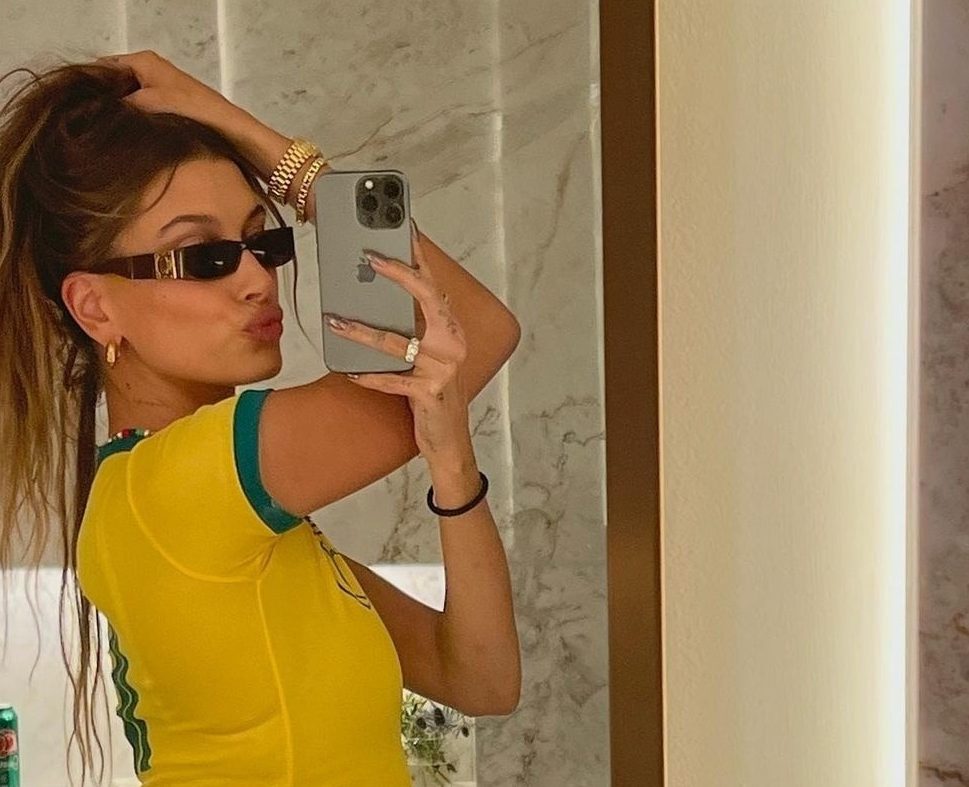 Hailey Bieber deixou os fãs brasileiros felizes ao compartilhar, na tarde desta segunda-feira, 5, uma foto vestindo uma camiseta do Brasil.
