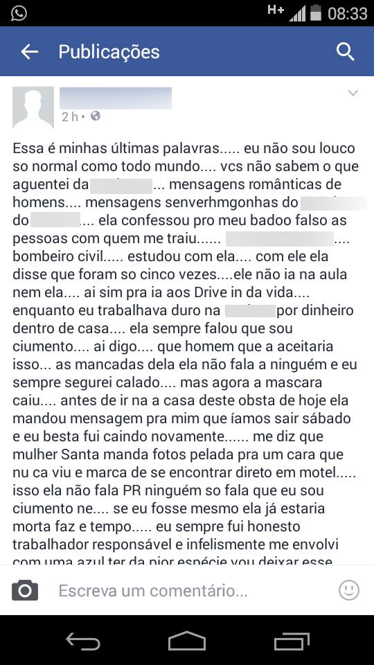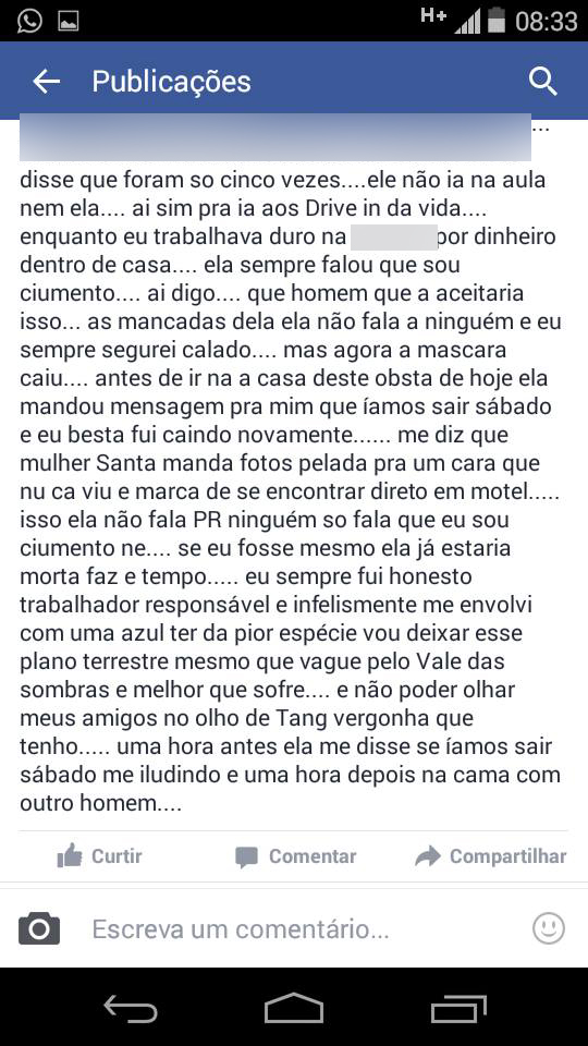 O caso ganhou repercussão nas redes sociais depois que ele postou tudo sobre a traição. Além de contar sobre os vários casos que descobriu, o homem postou algumas fotos íntimas da mulher. Ela supostamente mandava as imagens para outros homens. As publicações foram deletadas horas depois.