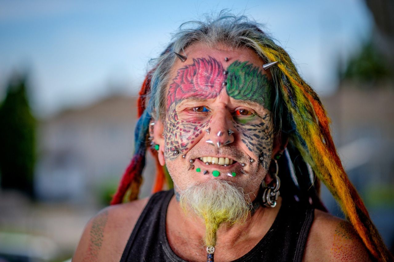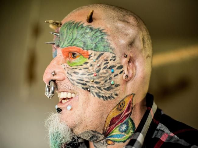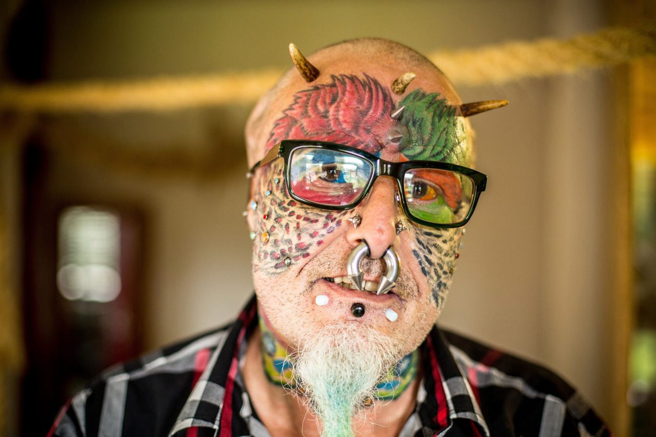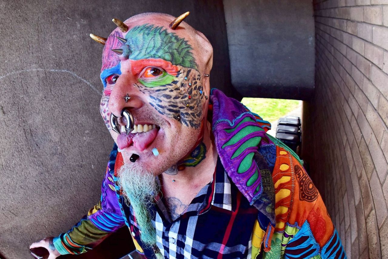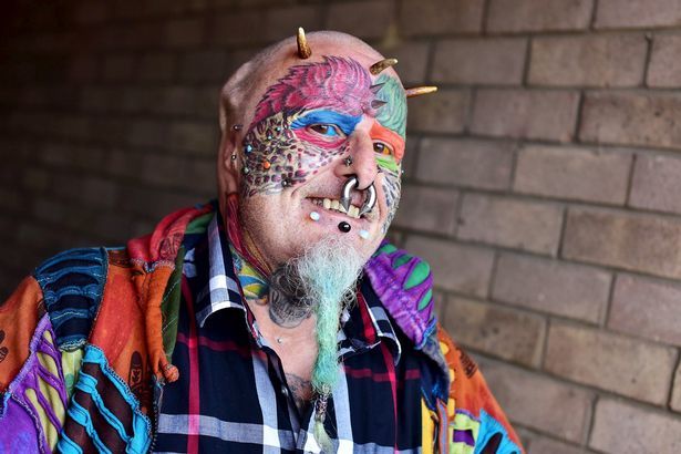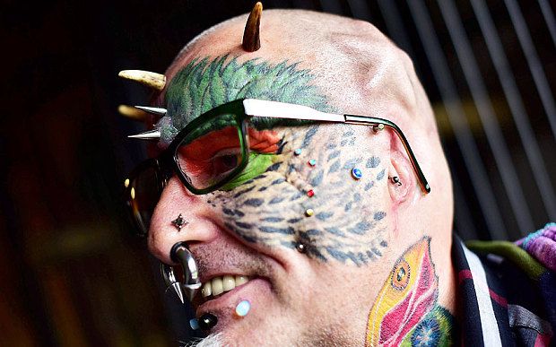 Para começar, o britânico com cara de maluco tem nada menos do que 110 tatuagens. Além das tatuagens, ele ainda modificou o corpo com nada menos do que 50 piercings em diversas partes do seu corpo.