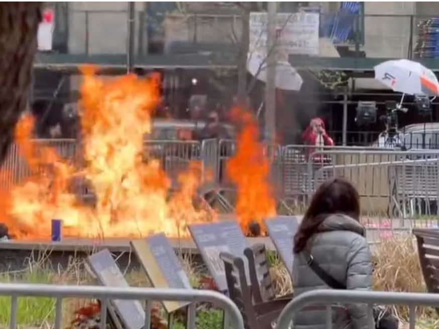 Testemunhas disseram que o homem tirou panfletos de uma mochila e os jogou para cima antes de se encharcar com um líquido e atear fogo em si próprio o que fez com que um cheiro de fumaça se espalhasse pela praça. Um desses folhetos incluía referências a “bilionários malvados”, mas aparentemente sem nenhuma menção a Trump.