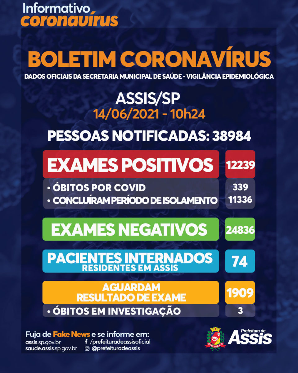 Assis tem 12.239 casos confirmados, dos quais são 11.336 curados e 339 óbitos. Há quatro mortes, de homens de 56, 72 e 89 anos, e mulher, de 30, em investigação.