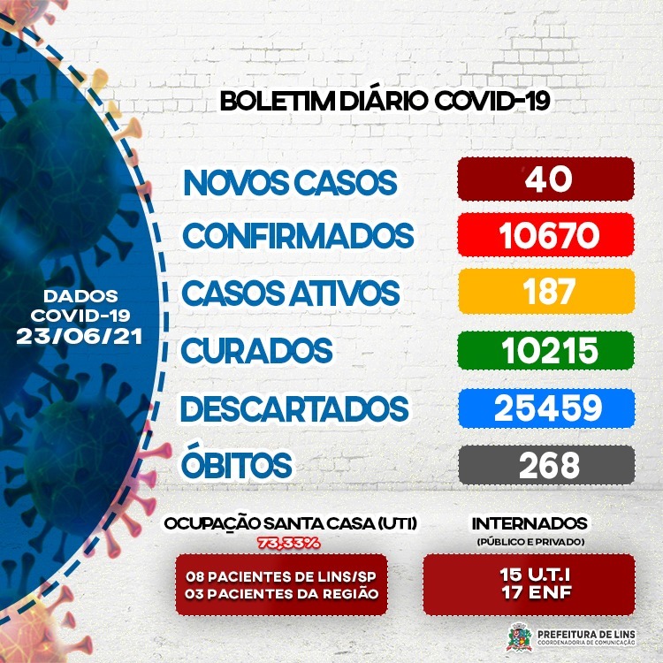 A cidade registra 10.670 casos confirmados, dos quais são 10.215 curados e 268 óbitos.