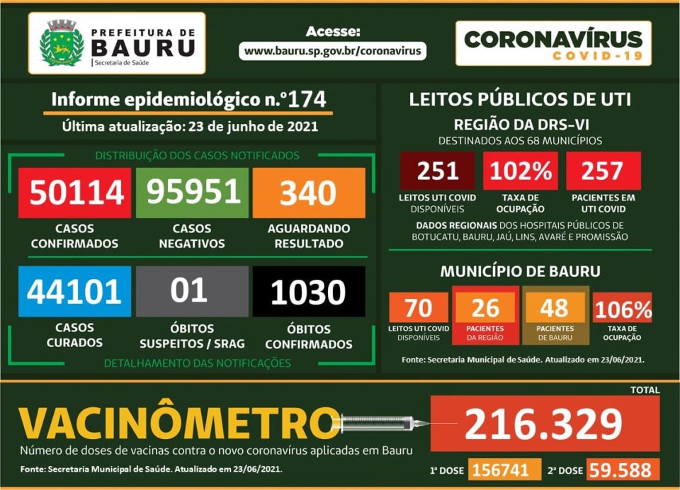 Bauru contabiliza 50.114 casos confirmados da doença, dos quais 44.101 estão curados e 1.030 óbitos. Há uma morte em investigação.