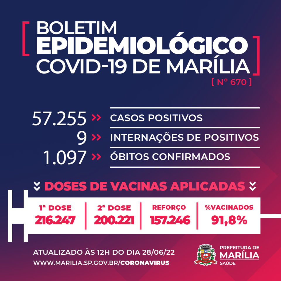Marília registra 57.255 casos confirmados da doença desde o início da pandemia. A cidade conta com nove pessoas internadas com resultado positivo para a Covid.