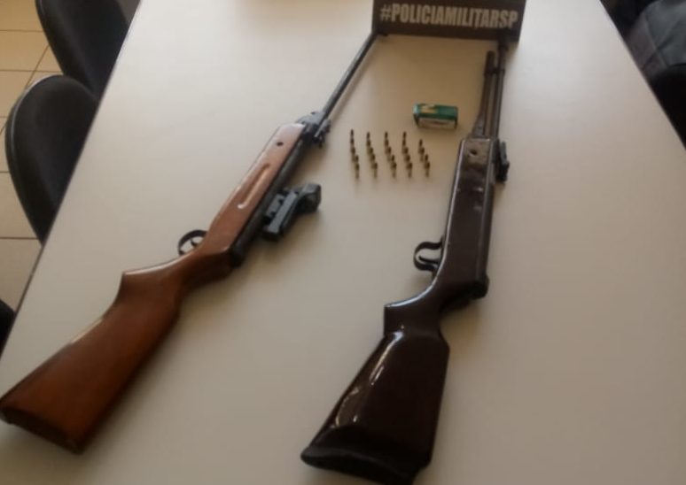 Ao chegar no local dos fatos, os policiais encontraram o morador saindo da casa. Ao ser questionado, o homem confirmou que tinha duas espingardas de pressão que estariam no porão do imóvel ao lado.