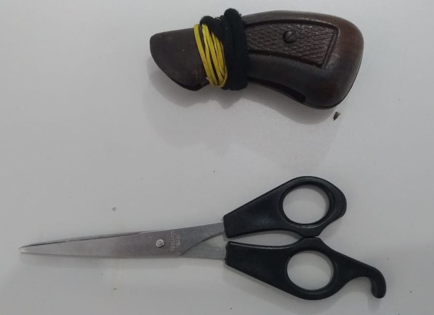 Com o homem foi encontrada uma coronha de revólver e uma tesoura, utilizadas em menção a tentativa do roubo.