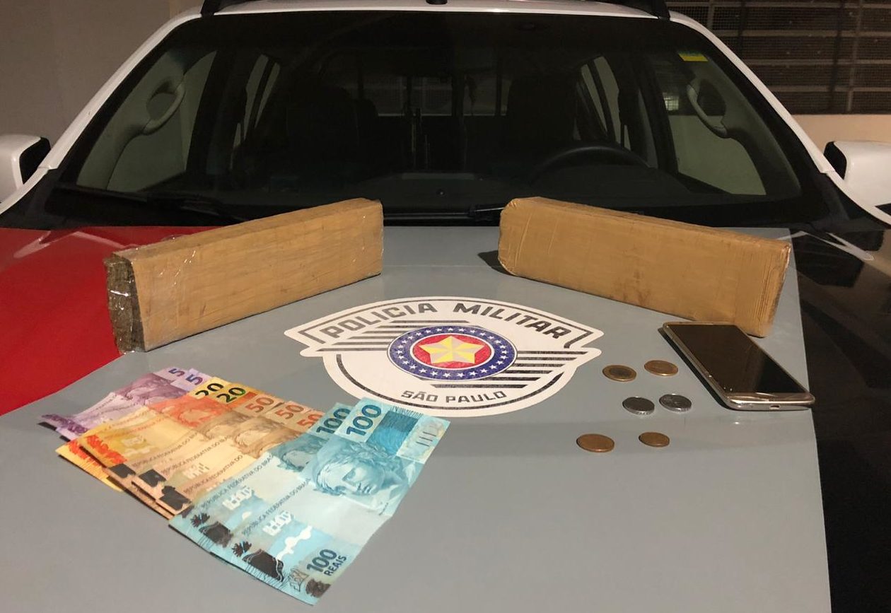 A PM fez a abordagem e localizou no bolso da bermuda do condutor R$ 403,35. No interior do automóvel havia dois tijolos de maconha.