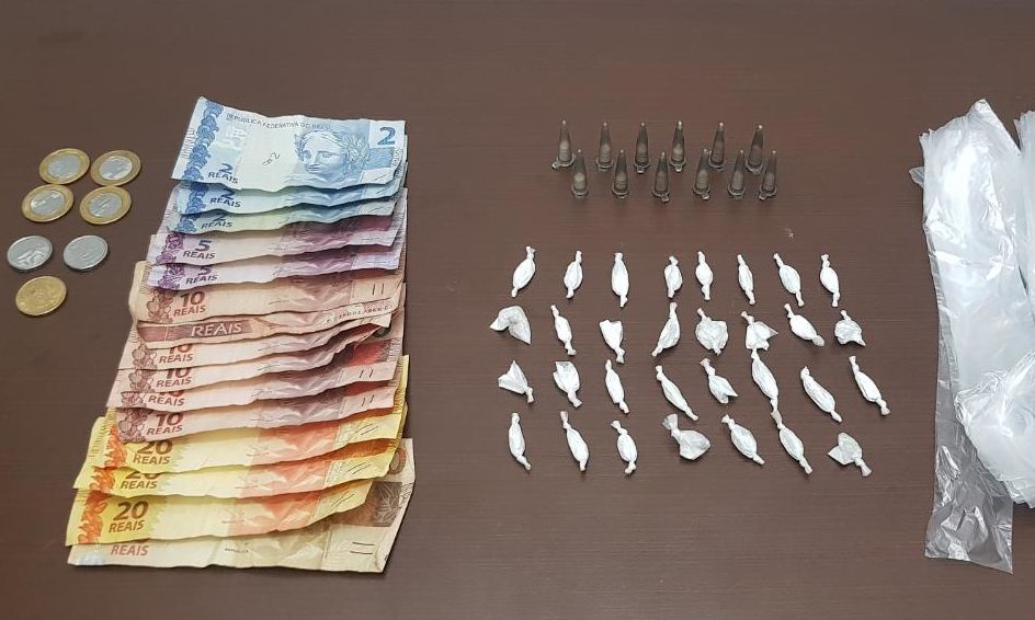 Com ele foram encontrados R$ 191,25. Os objetos jogados eram dois pinos com cocaína. Indagado, confessou que estava vendendo drogas e que iria entregar os pinos para o motociclista na hora que a polícia apareceu.
