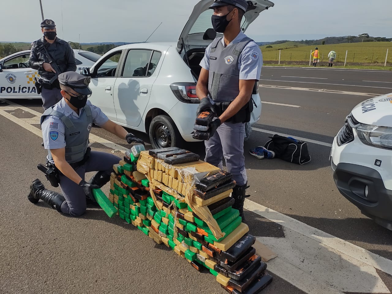Por volta das 9h, os policiais abordaram um veículo Renault Sandero, placas Mercosul. Durante a vistoria, foram encontrados vários tabletes de maconha.